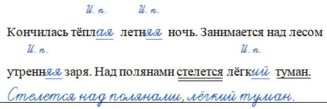 Кончилась тёпл__ летн__ ночь. Занимается над лесом утренн__ заря. Над полянами стелется лёгк__ туман.