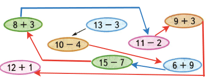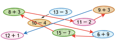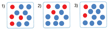 На каждом рисунке по 11 кружков. Раскрась каждый рисунок красным и синим карандашами так, чтобы красных кружков стало меньше, чем синих: на рисунке 1 — на 3 кружка, на рисунке 2 — на 5 кружков, на рисунке 3 — на 7 кружков.