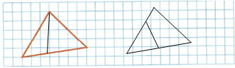 Начерти такой же треугольник. В каждом треугольнике проведи один отрезок так, чтобы он разделил первый треугольник на два треугольника, а второй — на один треугольник и один четырёхугольник.