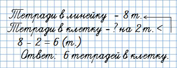 У Лены 8 тетрадей в линейку, а в клетку на 2 тетради меньше. Сколько у Лены тет­радей в клетку?