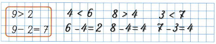 На сколько 9 больше, чем 2? 4 меньше, чем 6? 8 больше, чем 4? 3 меньше, чем 7?