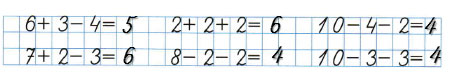 | 6 + 3 - 4 = | 2 + 2 + 2 = | 10 - 4 - 2 = |