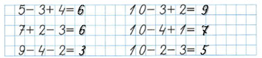| 5 - 3 + 4 = | 10 - 3 + 2 = |