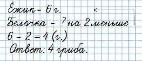 Ёжик собрал 6 грибов, а белочка — на 2 гриба меньше.