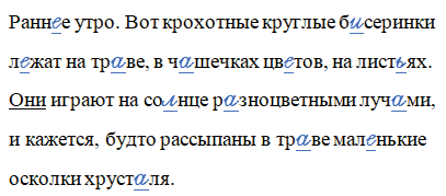 Ранн_е утро. Вот крохотные круглые б_серинки л_жат на тр_ве, в ч_шечках цв_тов, на лист_ях. Они играют на со_нце р_зноцветными луч_ми, и кажется, будто рассыпаны в тр_ве мал_нькие осколки хруст_ля.