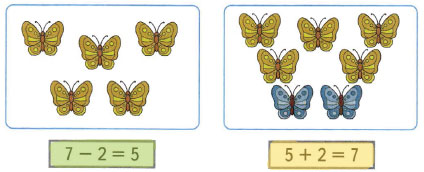 2) Чтобы перейти с левой картинки на правую, нужно использовать запись в зелёной рамке, потому что было 7 бабочек, а стало 5. Значит, 2 бабочки убрали. Как это записать?