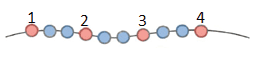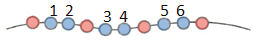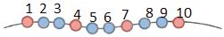 Раскрась бусинки: одна - красная, две - синие, одна - красная, две - синие ...
