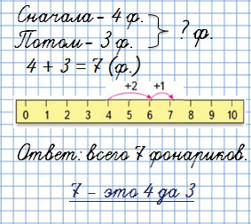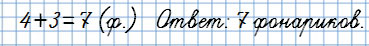 Дописываю условие и ставлю вопрос: Сначала Коля сделал из бумаги 4 фонарика, а потом ещё 3. Сколько всего фонариков сделал Коля?