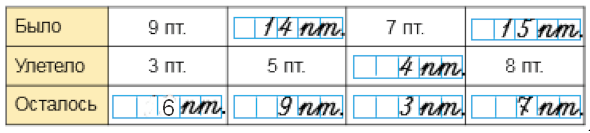 Составь по таблице четыре задачи про птиц, заполняя окошки своими числами. Запиши ответ каждой задачи в третьей строке таблицы.
