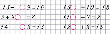 Вставь в кружки знак действия «+» или «-» заполни пропуски такими числами, чтобы получились верные равенства.