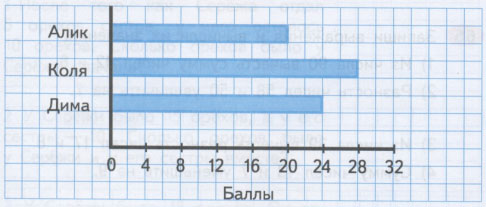 Дима, Алик и Коля заняли три первых места на математической олимпиаде. Набранные ими баллы представлены на диаграмме.