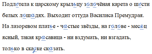 Подл_тела к царскому крыл_цу з_л_чёная карета о ш_сти белых л_ш_дях. Выходит оттуда Василиса Премудрая. На лазоревом плат_е - ч_стые звёзды, на г_л_ве - мес_ц ясный, такая кр_савица - ни вздумать, ни взгадать, тол_ко в ска_ке ск_зать.