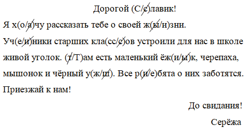 Мне прислал письмо мой друг Сергей. Мы с ним часто общаемся. Но за лето он забыл правила. Помоги ему - вычеркни неверные буквы в скобках. Проверь себя, помнишь ли ты правила.