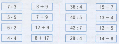| 7 • 3 = 12 + 9 = 21 | 36 : 4 = 13 - 4 = 9 |