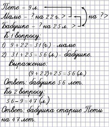 10. Пете 9 лет. Мама на 22 года старше Пети, а бабушка на 25 лет старше мамы. Сколько лет бабушке?
