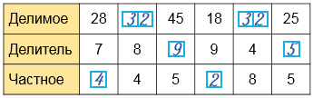 28 : 7 = 4