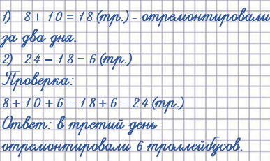 1. За три дня рабочие отремонтировали 24 троллейбуса; в первый день 8 троллейбусов, во второй 10. Сколько троллейбусов они отремонтировали в третий день?