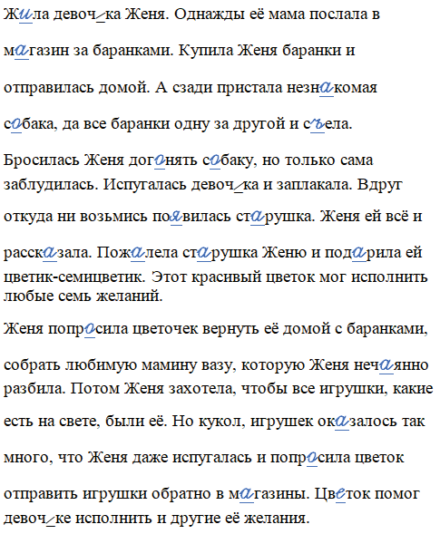 Ж_ла девоч_ка Женя. Однажды её мама послала в м_газин за баранками. Купила Женя баранки и отправилась домой. А сзади пристала незн_комая с_бака, да все баранки одну за другой и с_ела.