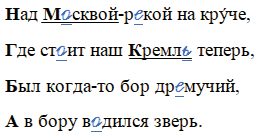 Москвой (словарное слово), реко́й (безударный гласный в корне слова, проверяем словом, в которым данный гласный будет находится под ударением; ре́чка), стои́т (безударный гласный в корне слова, проверяем словом, в которым данный гласный будет находится под ударением; сто́я), Кремль (ь для обозначения мягкости), дрему́чий (безударный гласный в корне слова, проверяем словом, в которым данный гласный будет находится под ударением; дрё́ма), води́лся (безударный гласный в корне слова, проверяем словом, в которым данный гласный будет находится под ударением; во́дится).