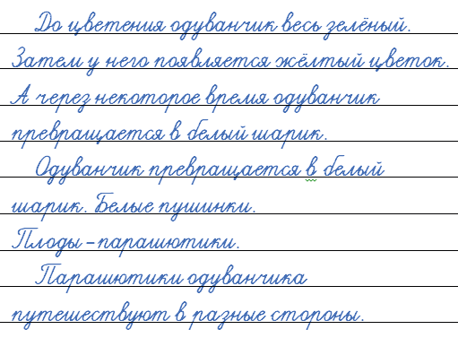 Весной он три раза меняет свои «одежды». До цветения одуванчик весь зелёный. Затем у него появляется жёлтый цветок. А через некоторое время одуванчик превращается в белый шарик. Белые пушинки одуванчика медленно летят над зелёной полянкой и голубой рекой. Во все концы рассылает одуванчик свои плоды-парашютики.