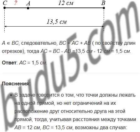 Точки А, В и С лежат на одной прямой. Известно, что АВ = 12 см, ВС = 13,5 см. Какой может быть длина отрезка АС?