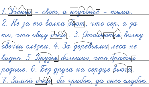 1. Учен_е - свет, а неучен_е - тьма. 2. Не за то волка б_ют, что сер, а за то, что овцу с_ел. 3. Отол_ются волку овеч_и слёзки. 4. За дерев_ями леса не видно. 5. Друз_я большие, что брат_я родные. 6. Без друга на сердце в_юга. 7. Зимой с_ел бы грибок, да снег глубок.