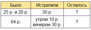 У Марины было 64 рубля. Утром она купила себе бутерброд за 10 р., а вечером - упаковку сока за 30 р. Сколько денег осталось у Марины после покупок?