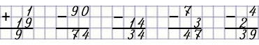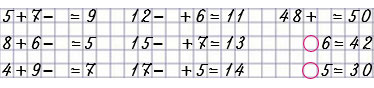 Запиши пропущенные числа и вставь в кружки знаки действий «+» и «—» так, чтобы получились верные равенства. Для двух последних равенств найди два решения и запиши одно из них.