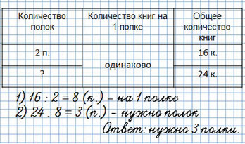 На две полки поставили 16 книг, распределив их поровну. Сколько нужно полок, чтобы так же расставить 24 книги?