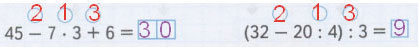 Запиши, в каком порядке надо выполнять действия в выражениях, и вычисли их значения.