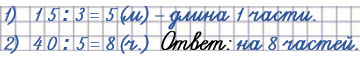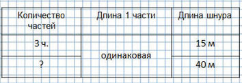 Шнур длиной 15 м разрезали на 3 равные части. На сколько таких же частей можно разрезать шнур длиной 40 м?