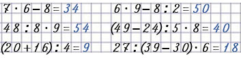 1) 6 • 9 = 54 2) 8 : 2 = 4 3) 54 - 4 = 50