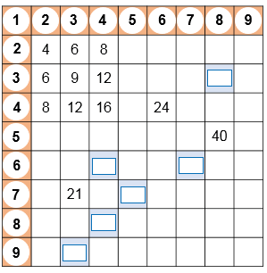 3) Заполни все клетки значениями произведений, в которых один из множителей равен 8. Сколькими способами это можно сделать?