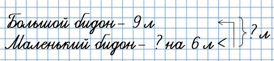 В большом бидоне 9 л молока, а в маленьком - на 6 л меньше. Сколько всего литров молока в этих бидонов?