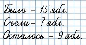 11. В вазе было 15 яблок. После того как несколько яблок съели, в вазе осталось 9 яблок. Сколько яблок съели?