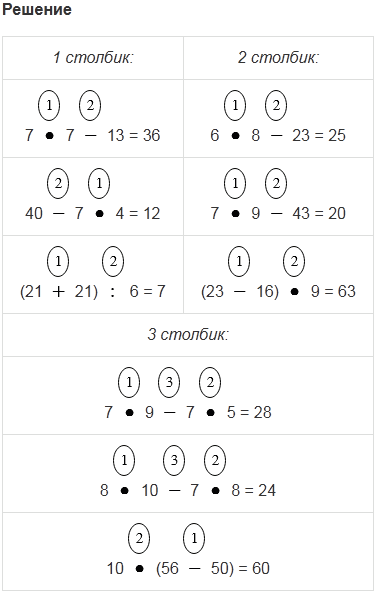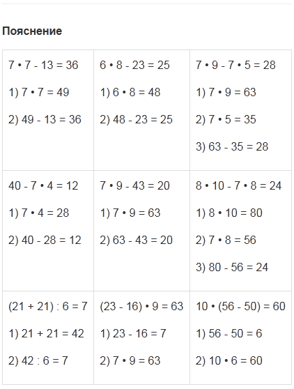 | (21 + 21) : 6 | (23 - 16) • 9 | 10 • (56 - 50) |