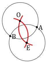 Начинаем с того, что с помощью циркуля и линейки строим две окружности (части окружностей, смотри выделенное красным) радиуса R с центрами в точках А и В. Для этого берем раствор циркуля равный длине радиуса R, далее ставим острие циркуля в точку А и чертим нужную нам часть окружности, затем также ставим острие циркуля в точку В и чертим нужную нам часть окружности. В данном случае точки А и В располагаются друг относительно друга так, что расстояние между ними меньше, чем 2R и окружности пересекутся в двух точках, обозначим их О и Е.