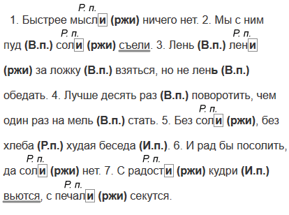 1. Быстрее мысл.. ничего нет. 2. Мы с ним пуд сол.. съели. 3. Лень лен.. за ложку взяться, но не лен.. обедать. 4. Лучше десять раз поворотить, чем один раз на мель стать. 5. Без сол.., без хлеба худая беседа. 6. И рад бы посолить, да сол.. нет. 7. С радост.. кудри вьются, с печал.. секутся.