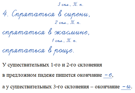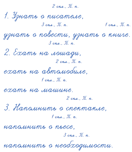 1. Узнать о (писатель, повесть, книга). 2. Ехать на (лошадь, автомобиль, машина). 3. Напомнить о (спектакль, пьеса, необходимость). 4. Спрятаться в (сирень, жасмин, роща)