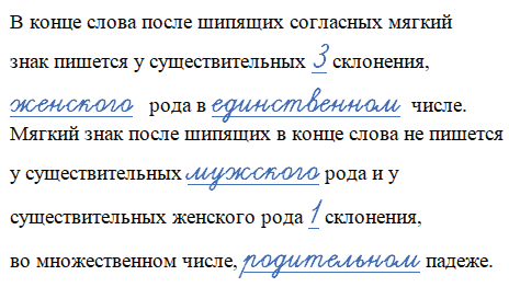 В конце слова после шипящих согласных мягкий знак пишется у существительных ___ склонения, ___ рода в ____ числе. Мягкий знак после шипящих в конце слова не пишется у существительных _____ рода и у существительных женского рода ___ склонения, во множественном числе, ________ падеже.