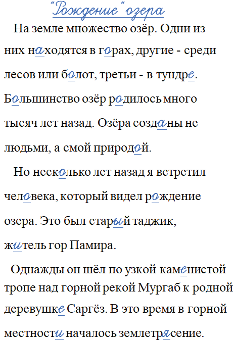 На земле множество озёр. Одни из них н_ходятся в г_рах, другие - среди лесов или б_лот, третьи - в тундр_. Б_льшинство озёр р_дилось много тысяч лет назад. Озёра созд_ны не люд_ми, а самой природ_й.