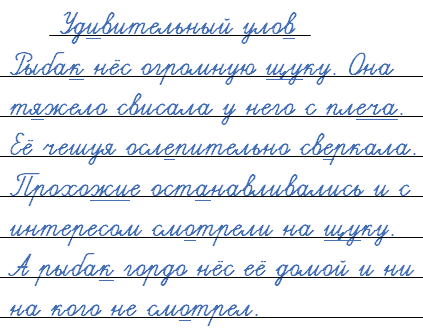 Рыбак нёс огромную щуку. Щука тяжело свисала у него с плеча. Чешуя щуки ослепительно сверкала. Прохожие останавливались и с интересом смотрели на щуку. А рыбак гордо нёс щуку домой и ни на кого не смотрел.