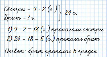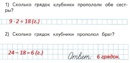 13. Брат и две его сестры пропололи 24 грядки с клубникой. Сколько грядок прополол брат, если каждая из сестёр прополола по 9 грядок? Прочитай каждый вопрос и запиши к нему действие