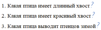 1. Какая птица имеет длинный хвост? (вопросительное предложение) 2. Какая птица имеет красивый хвост? (вопросительное предложение) 3. Какая птица выводит птенцов зимой? (вопросительное предложение)