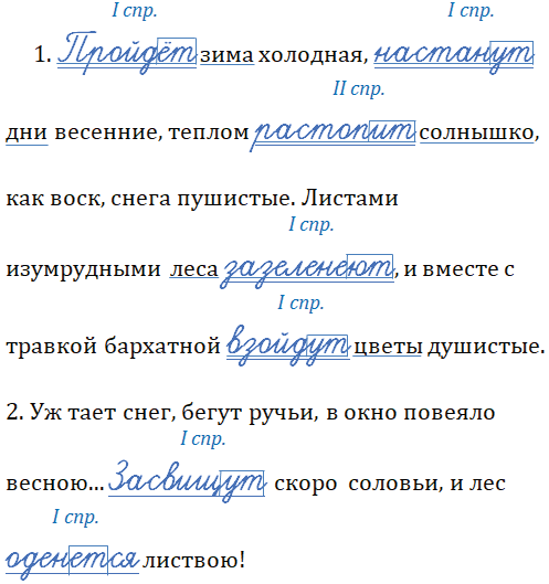 1. (Пройти) зима холодная, (настать) дни весенние, теплом (растопить) солнышко, как воск, снега пушистые. Листами изумрудными леса (зазеленеться), и вместе с травкой бархатной (взойти) цветы душистые. (С. Дрожжин) 2. Уж тает снег, бегут ручьи, в окно повеяло весною... (Засвистать) скоро соловьи, и лес (одеться) листвою! (А. Плещеев)