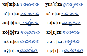 Чашка (чашечка), ложка (ложечка), лавка (лавочка), кофта (словарное слово), шапка (шапочка), шубка (шуба), указка (указать), каска (касок), локти (локоток), когти (коготь), лодка (лодочка), щётка (щёточка).