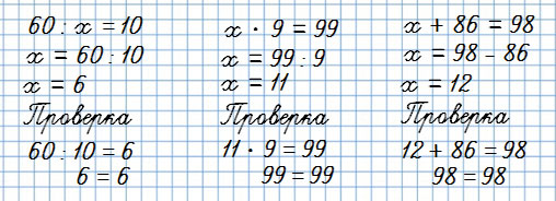 60 : x = 10 x • 9 = 99 x + 86 = 98