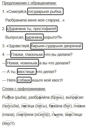 Прочитайте строки из «Сказки о рыбаке и рыбке» А. Пушкина и отрывок из народной сказки «Лисичка со скалочкой». Выпишите предложения с обращениями, которые вам понравились. Обращения обведите. Что может рассказать о герое обращение, которое он использует в речи?