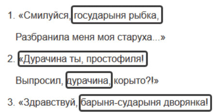 Прочитайте строки из «Сказки о рыбаке и рыбке» Александра Пушкина и отрывок из народной сказки «Лисичка со скалочкой». Выпишите три предложения с обращениями. Обращения обведите. Что может рассказать о герое обращение, которое он использует в речи?