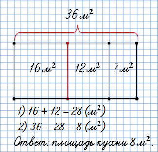 22. У бабушки на даче две комнаты и кухня. Общая их площадь 36 м². Площадь одной комнаты 12 м², а другой - 16 м². Узнай площадь кухни.